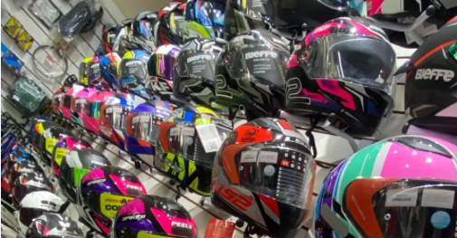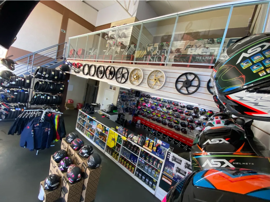 Estoque alto de capacetes, jaquetas, calças, kit relação pastilhas e lonas de freio, óleo de diversas marcas, baús e suportes de motoboy.
